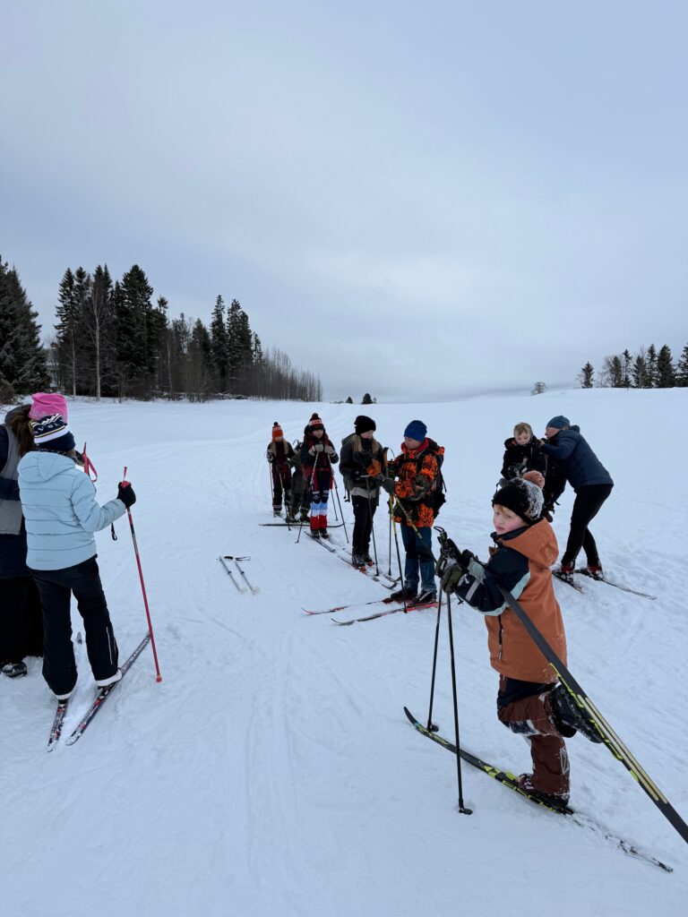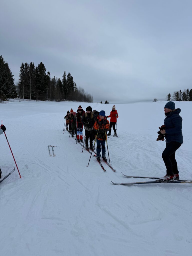 Dag två denna skidvecka samlades vi i tvärgrupperna och övade inför vår kommande längdskiddtur på fjället.